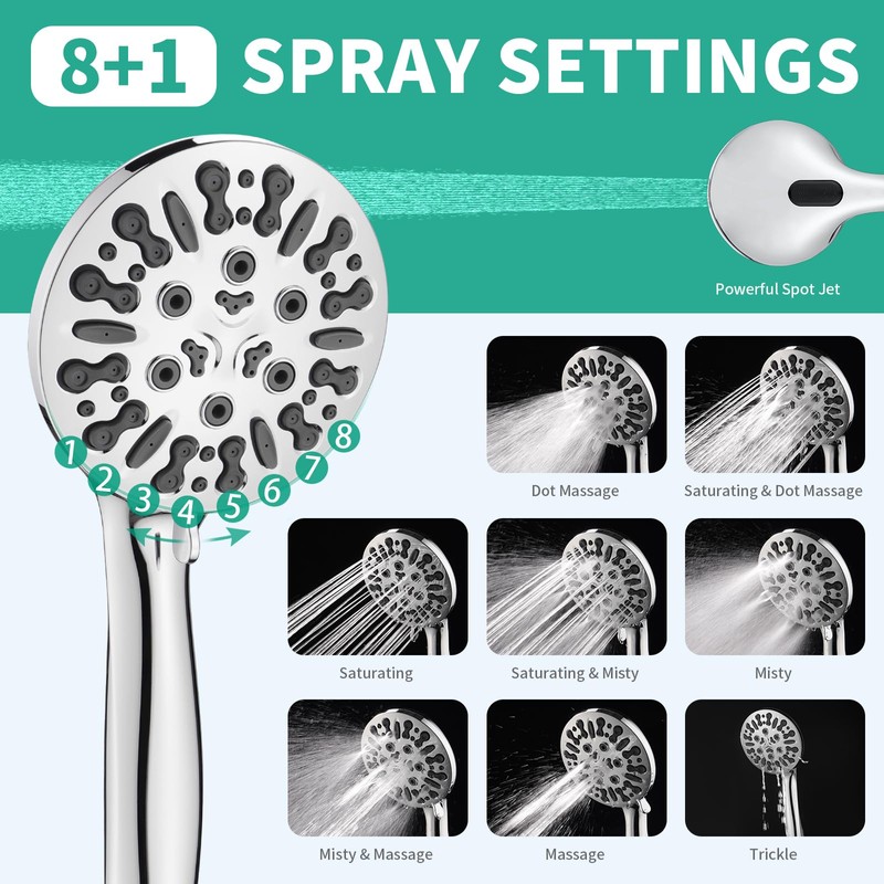 - 【8 Shower Modes + 1 Jet Mode】Compared with a regular shower head, Our 4.7" large panel showerhead filter system for hard water has a larger water area, providing you a full body coverage when bathing. It includes 8 setting such as saturating spay, dot massage spray, massage spray, misty spray and so on. So you can enjoy a spa-like showers experience at home to help you relax better. And with a powerful built-in spot jet mode, it helps you clean floors, toilets and mops more easily.