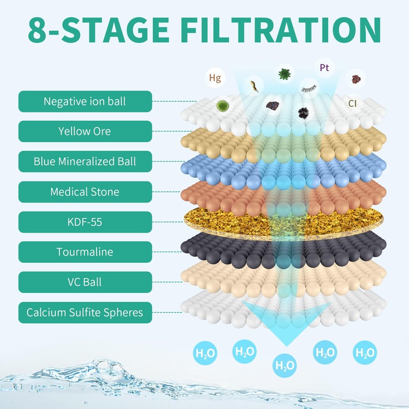 - 【Efficient Filtration System】Our water softener shower head for hard water are designed with a 8-stage high efficiency filtration system. This handheld shower head with filter contains a mixture of KDF-55, calcium sulphite, vitamin C and redox media, which can effectively removes contaminants from the shower water such as chlorine, fluoride and heavy metals. This shower filter for hard water brings you clean water which keeps your skin from getting dry and tight.