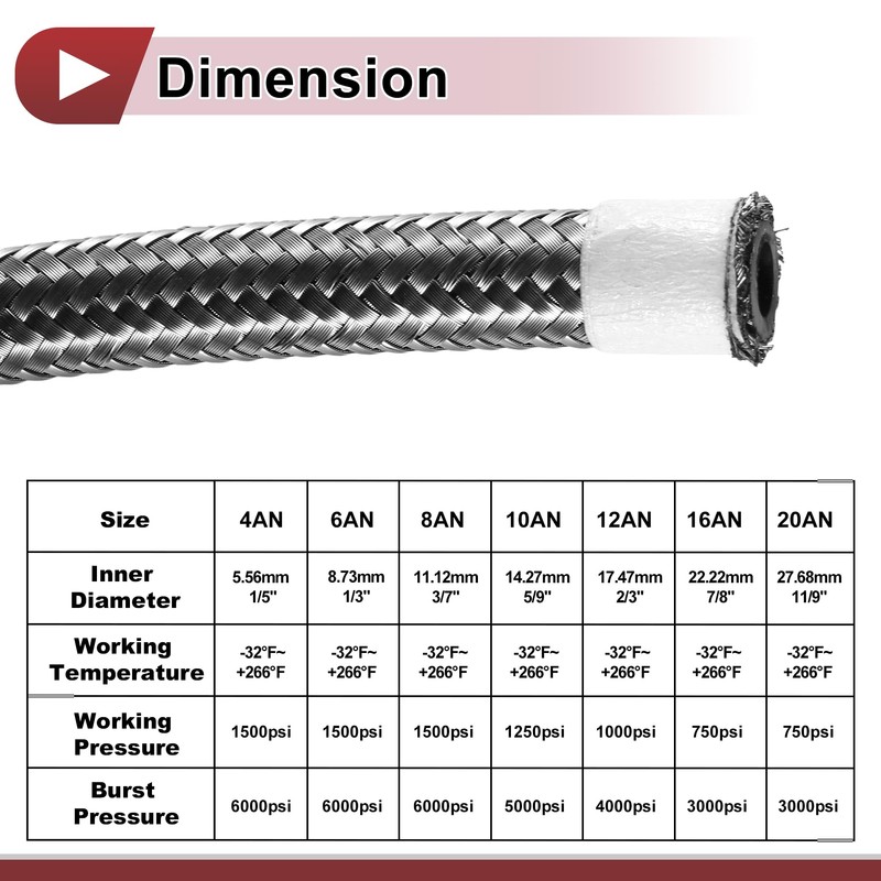 - Material:Work Pressure:1250psi, Burst Pressure:5000psi. The fuel hose is made of CPE Rubber,Stainless Steel Braided,which is durable and reliable,not easy to break or fade.
