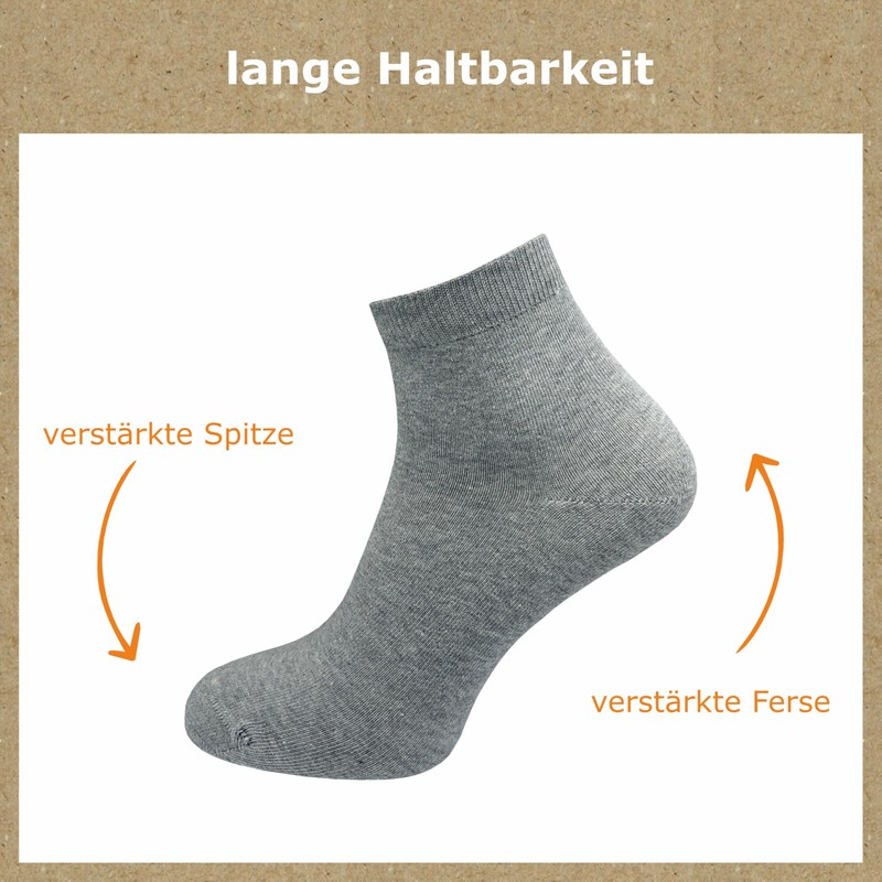 • 100% BAUMWOLLE: Baumwolle ist ein natürlicher Stoff, der für seine hohe Atmungsaktivität bekannt ist. Quartersocken aus 100% Baumwolle ermöglichen eine gute Luftzirkulation um die Füße herum und helfen Feuchtigkeit von der Haut wegzuleiten. Dadurch bleiben Ihre Füße trocken und frisch - auch bei anstrengenden Aktivitäten.