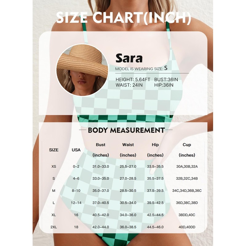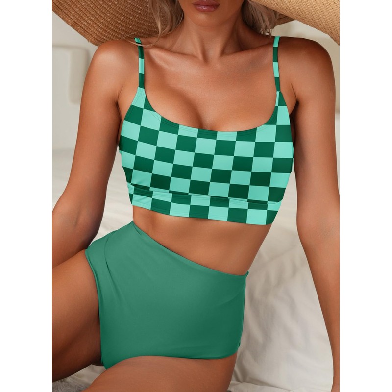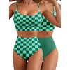 Herseas Women's 2 Piece Swim Suit Spaghetti Strap 2025 Summer Daisy Pattern Beach High Waisted Bikini Top with Reversible Bottom Bathing Suit Green Checkerboard Medium