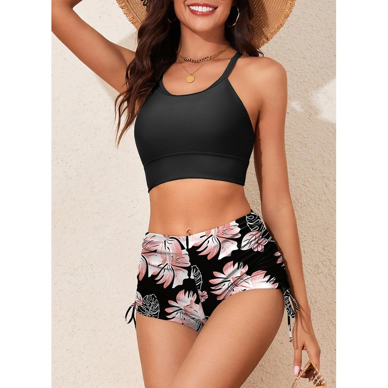 Herseas Women's Bikini Sets Black Floral Print High Waisted Longline Two Pieces Swim Suits Modest Sporty Teens Drawstring Swim Suits Bathing Suits X-Large