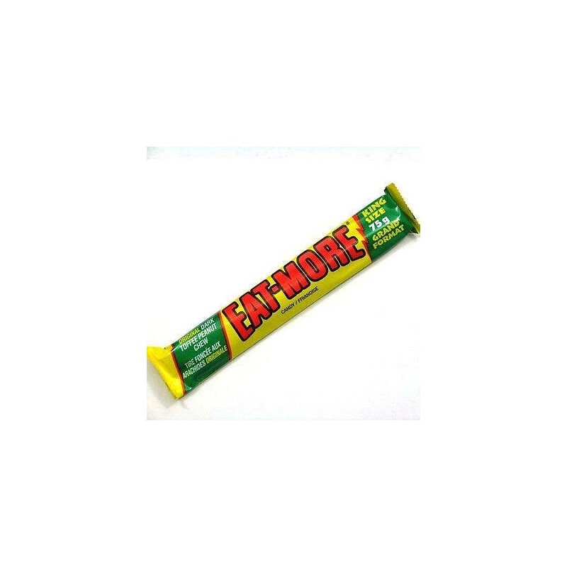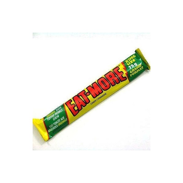 EAT-MORE Candy Bar is the original and delicious chewy dark toffee, peanut and chocolate candy bar.