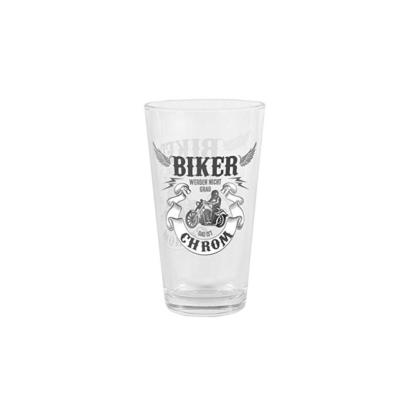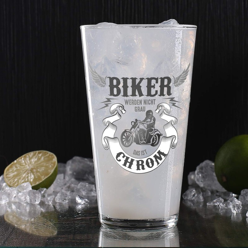 - For all motorcyclists with one or the other grey strand, we have a drinking glass with a funny saying. Bikers do not turn grey. This is chrome is the design of the biker drinking glass.