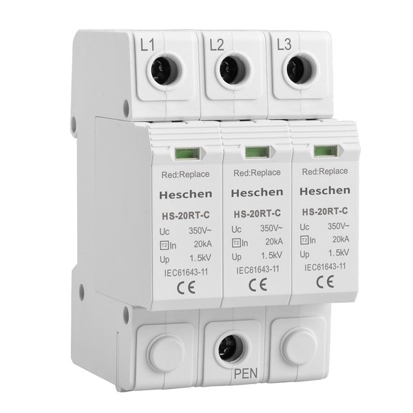 Heschen Surge Protector SPD, HS-20RT-C, 3P 350VAC 20KA, Integrated Replaceable Overcurrent Fuse, Fireproof, 35mm DIN Rail Mount