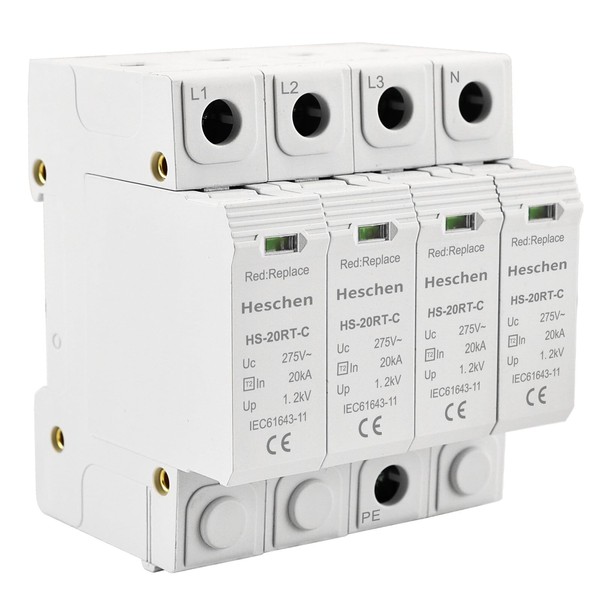 Heschen Surge Protector SPD, HS-20RT-C, 4P 275VAC 20KA, Integrated Replaceable Overcurrent Fuse, Fireproof, 35mm DIN Rail Mount