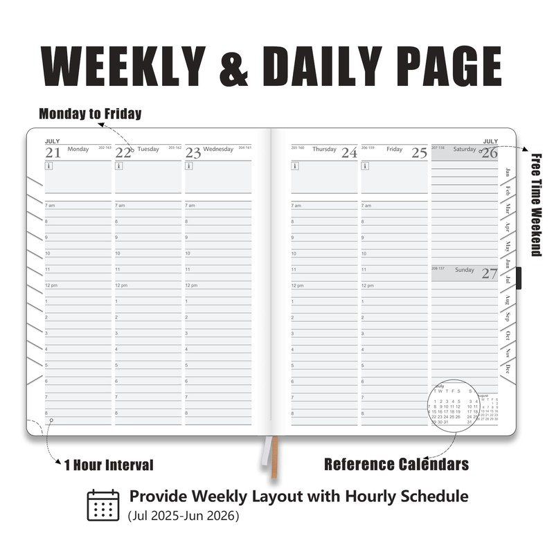 - Weekly Planning: Weekly view pages offer ample space to write (from July 2025 - June 2026 7:00am to 8:00pm) for more detailed planning, allowing you to keep track of your appointments, reminders, ideas and to-do lists every day of the week. Previous and next month reference calendars for long-term planning