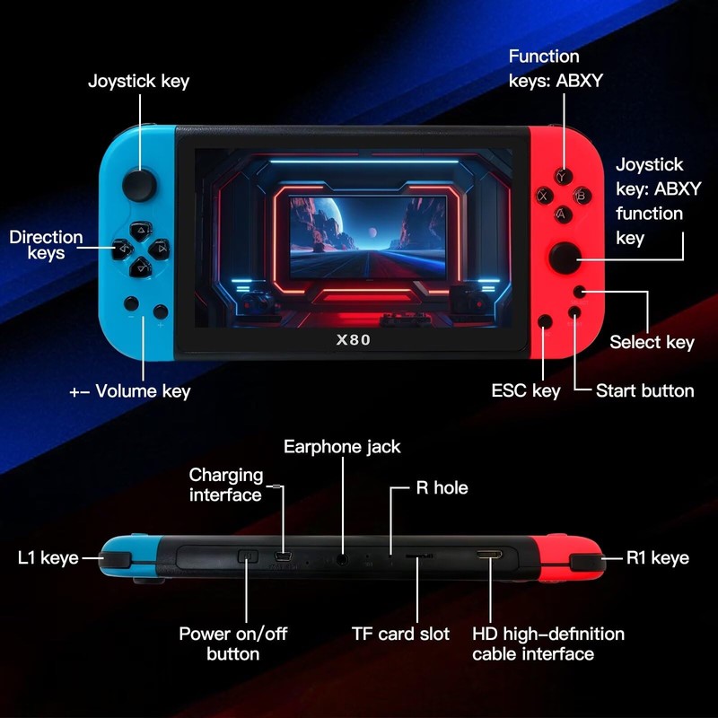 Upgraded X80 bluered Handheld Game console 16gb build in many games 7 inch HD Output Retro Game Cheap Children's Gifts Support TV Playing Games gameboy for kids adult
