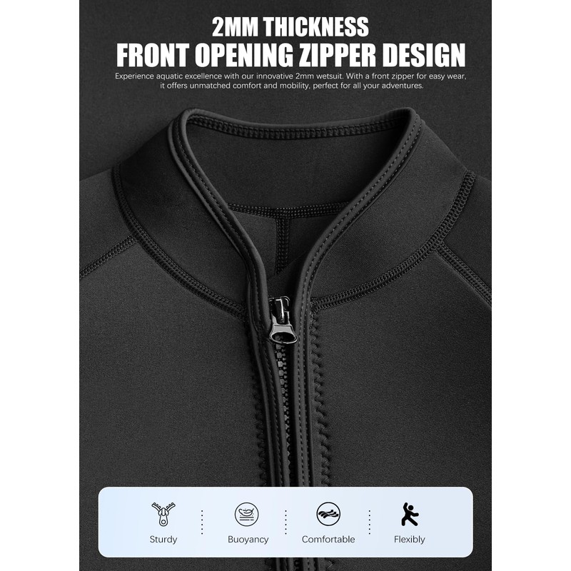 - What: The Hevto men shorty wetsuit is made with 2mm neoprene that provides both comfort and flexibility, making it easy to move around in the water. With a front zipper design, the mens wetsuit is easy to put on and take off, allowing you to quickly get in and out of the water.