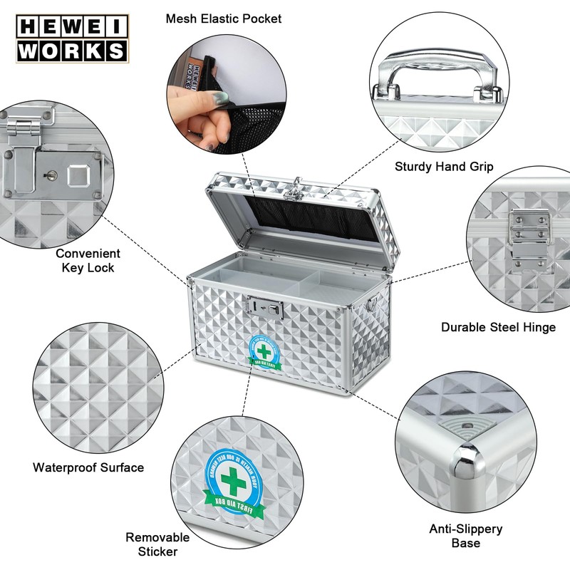 HEWEI WORKS Storage Box with Key Lock, Lockable Medicine Storage Box, Empty First Aid Box, Security Lock Box, Multipurpose Locking Box for Home and Outdoor Use (Silver, Large)