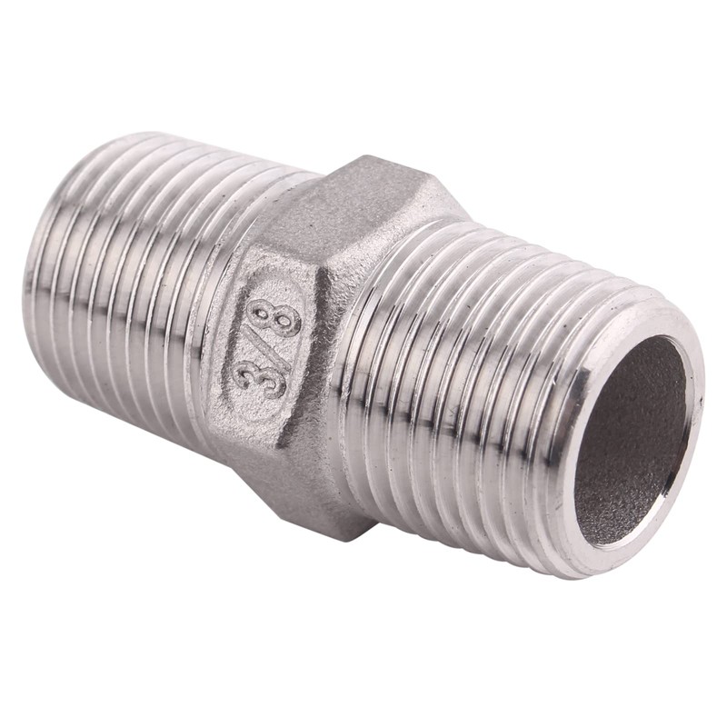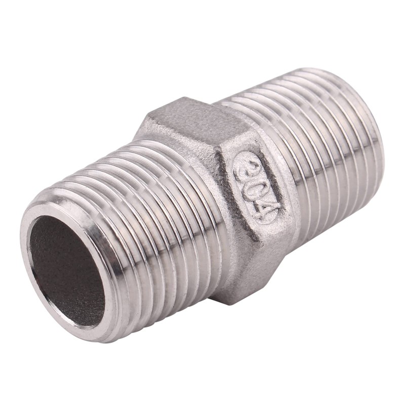 This DERPIPE hex nipple is a stainless steel 304 pipe fitting with male National Pipe Taper (NPT) threads on both ends for joining two pipes or extending pipe length. It has NPT threads for creating tighter seals than straight thread. The hexagonal shape allows for increased leverage during installation and disassembly with a wrench. When purchase pipe fittings, consider the application, as this will affect material type, shape, size and required durability. Fittings are available threaded or unthreaded, in many shapes, styles, sizes, and schedules (pipe wall thickness).