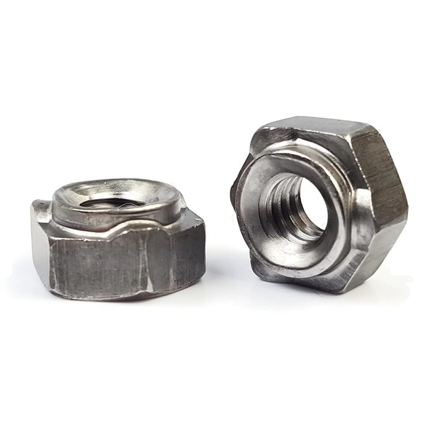 Hex weld nuts are used for providing a threaded hole to materials too thin to tap as well as attaching a threaded hole to parts that can only be accessed from one side. The 3 projections on weld nuts melt into the host material during welding for a quick and enduring hold while the long pilot helps to ensure a precise installation without slipping off the center and protecting the threads from welding spatter during welding operations.