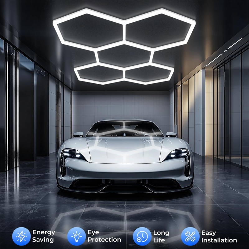 This is a hexagon patterned Garage light LED workshop lighting system can be mounted on the wall and ceiling use screws and zippers. The light spread from the pattern gives you a comfortable visual experience while illuminating an entire garage bay. Which brings the idea of lighting up your space to a whole new level.