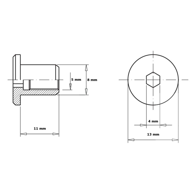- Flat head with hex socket for 4mm Allen key.