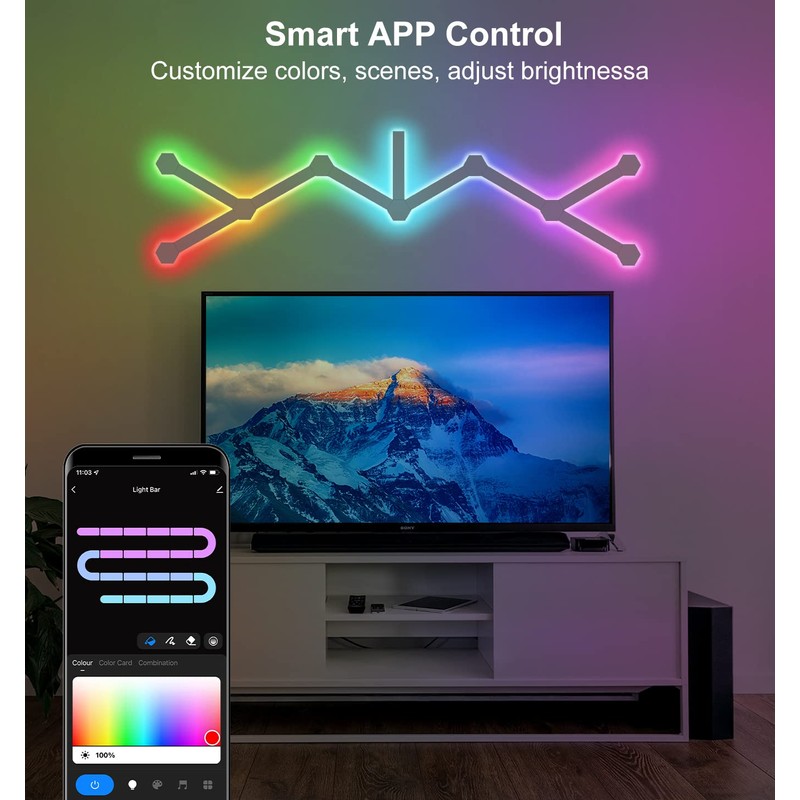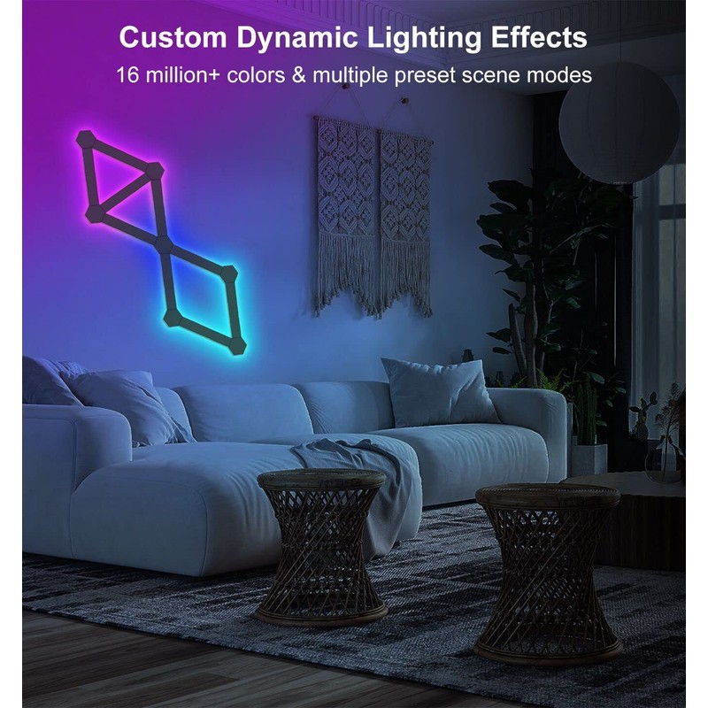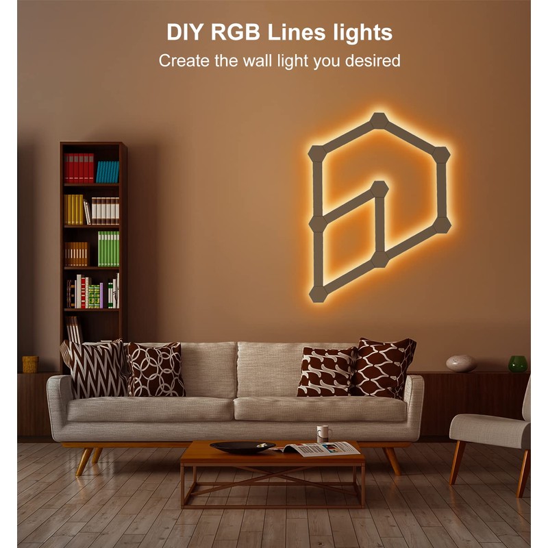 • 【DIY RGB Line lights】Any combination of 9 light bars and 9 hexagon lights, creating the wall light you desired.Displaying 16 million + RGB colors with rich scene modes. Backlit modular lighting brings infinite possibilities to your gaming room,bedroom and so many other scenes.