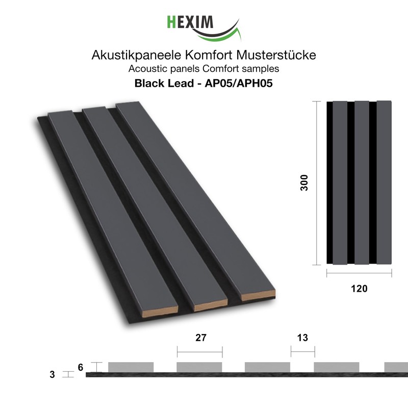 - 1 acoustic panel sample – dimensions: 300 x 120 x 9 mm, model: Black Lead – AP05 / APH05, material: felt and MDF – the panels are available in the formats 138.5 x 60 cm and 278 x 60 cm