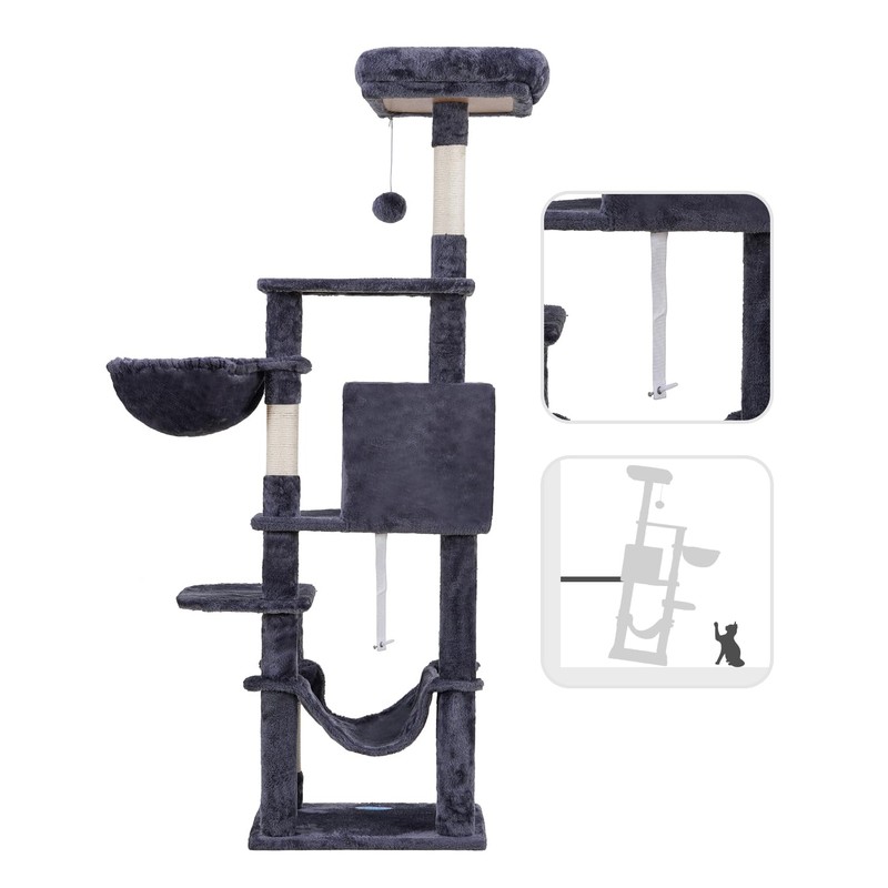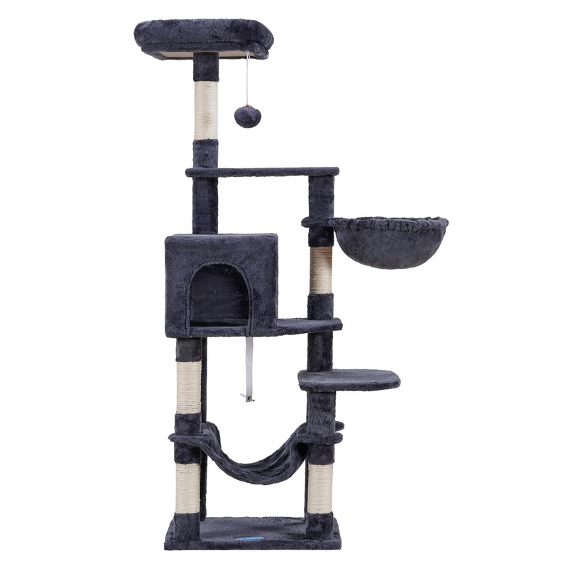 - [All-in-One Playground] This cat tree with 1 padded cat perche, 1 cozy caves, 1 fluffy basket, 1 pompoms, and 1 hammock, cats of different characters can all find their fave spot on this multi-level cat villa covered with plush all over—perfect for multi-cat households