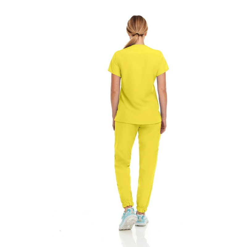 Hey Collection Womens Stretch V-Neck Jogger Scrubs Set, Medical Nursing Tops with Four Pocket Pants, Yellow, Large