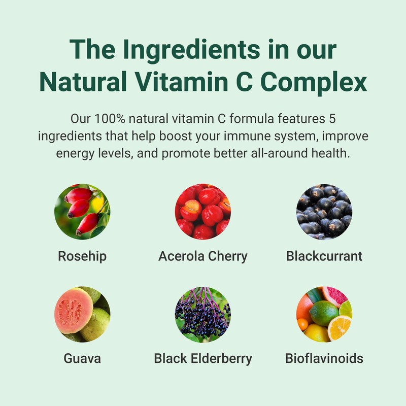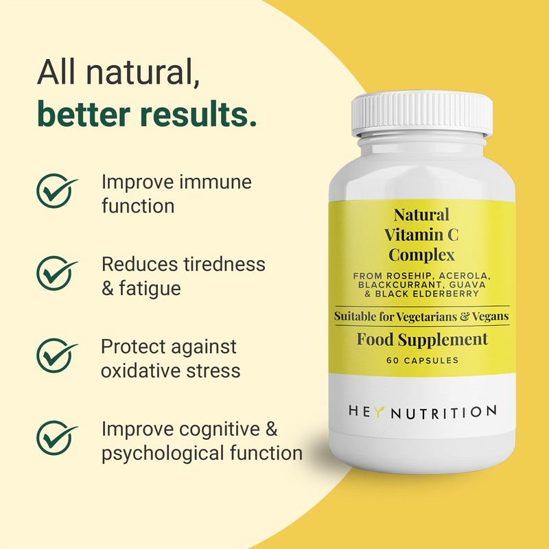Hey Nutrition Hey Nutrition Natural Vitamin C 250mg Complex from Rosehip, Acerola, Blackcurrant, Guava, and Elderberry - Immune Function, Stress, Metabolic Health, & Fatigue - Non-GMO, 60 Vegan Capsules