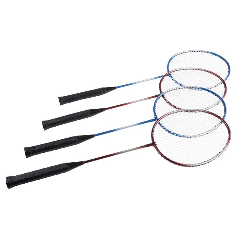 - PRODUCT DETAILS – 4 racquets measuring 25.5” long with an 8” wide racquet face, 3 shuttlecocks, regulation size net with poles and ground stakes, and a zip-up carrying case.