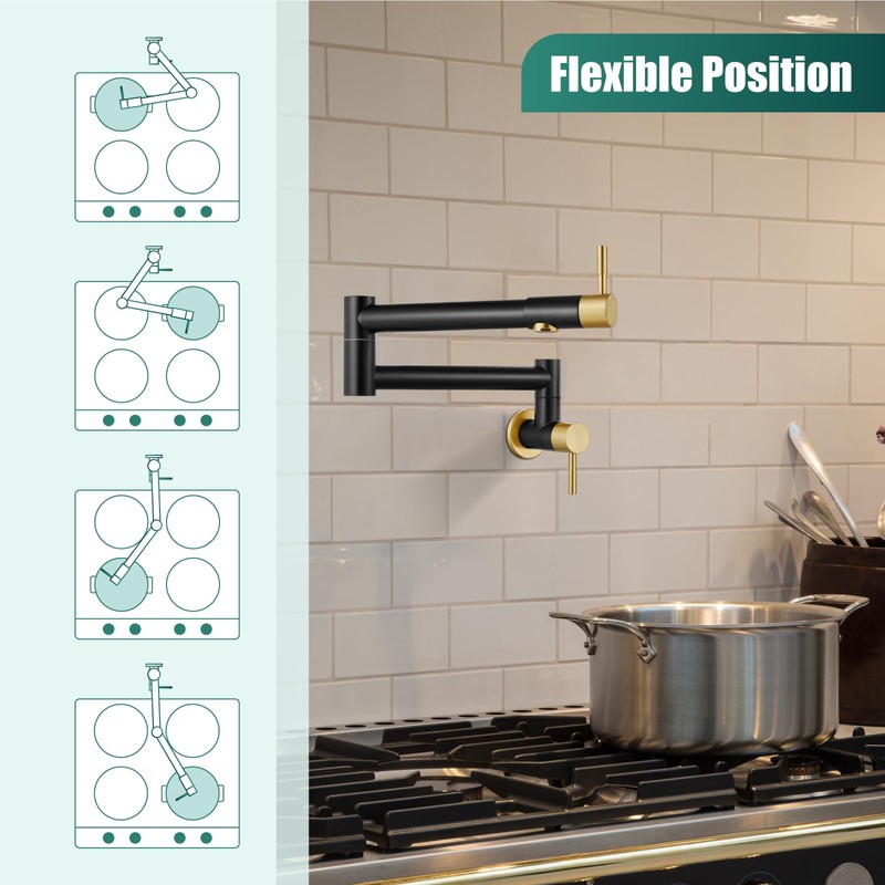 - 【PERFECT FOR FILLING POTS】: Wall-mounted matte black and brushed gold pot fillers are the perfect addition to any kitchen with the convenience of filling large pots directly on the stovetop