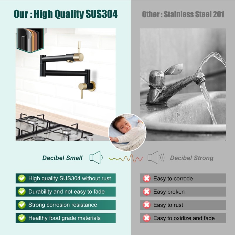 - 【Premium Material】: The core material of this mattle balck and brushed gold pot filler kitchen faucet is industrial-grade Stainless Steel, which increases the durability and reliability of the structure. The matte black-and-brushed gold finish will undoubtedly complement the modern look of your kitchen and is easy to clean