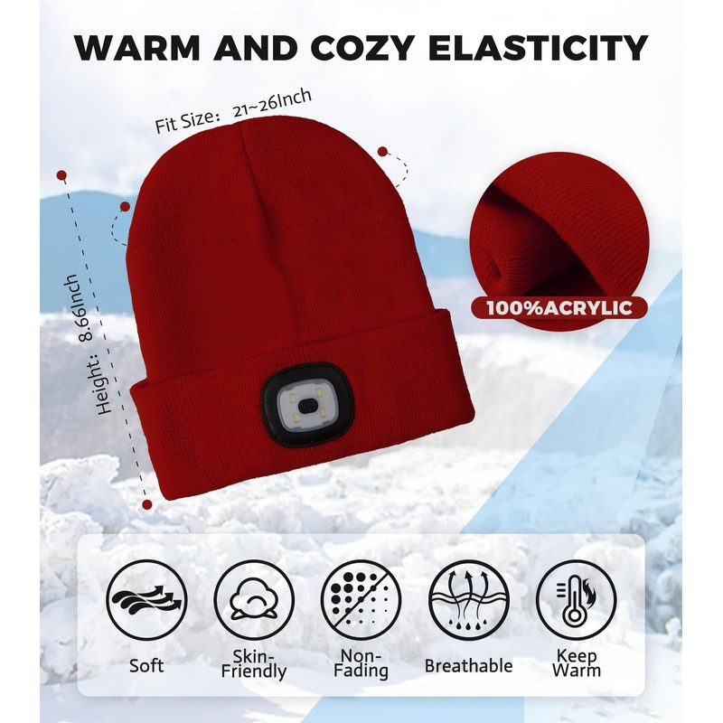 HEYAXA Unisex LED Beanie with Light, Rechargeable Headlamp Hat, Warm Knitted Cap Valentines Day Gifts for Him Men Adults Teens Women Dad (DEEP RED)