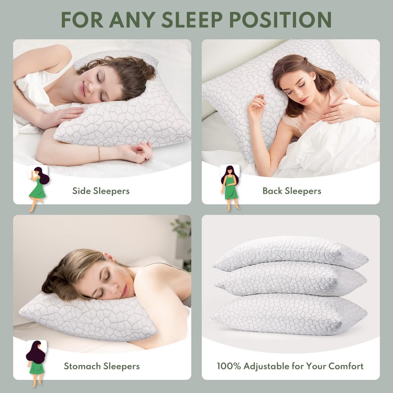 • Comfort for Every Sleeper Pillows Queen Size Set of 2 - Discover the ultimate sleep experience with our adjustable shredded memory foam pillows, tailored to your individual needs. Whether you are a side, back, or stomach sleeper, our bed pillow adapts to your shape, providing unparalleled support and comfort. Say goodbye to sleepless nights and wake up feeling rejuvenated!
