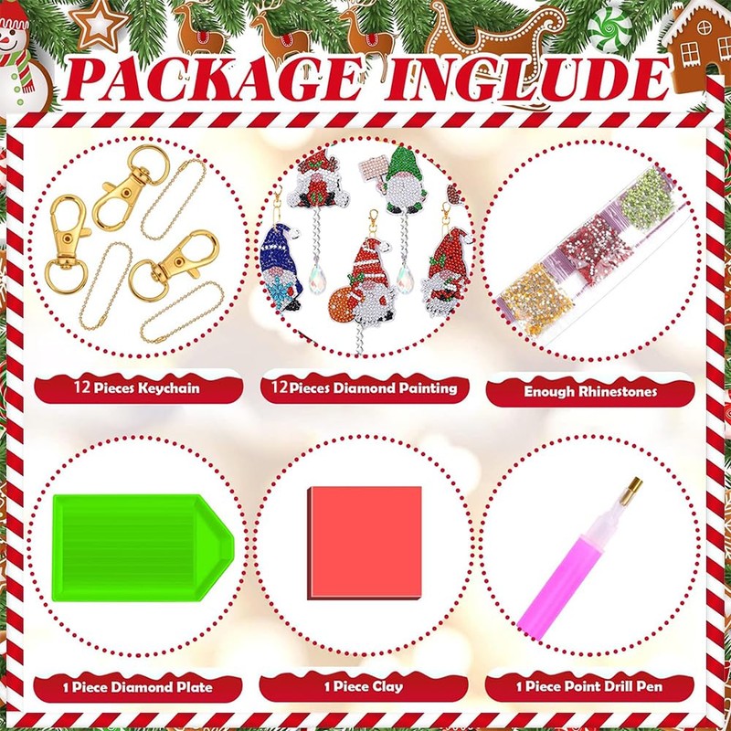 - Diamond painting Christmas gnome set: you will receive 12 diamond painting Christmas pendants in different styles (including 12 acrylic plates with motif of Christmas gnome for children, 12 crystal decorative chains, 12 teardrop diamond crystals, 12 chains and key rings, 1 diamond painting pen, 1 gemstone tray, 1 jelly glue, enough rhinestones) to meet your decoration needs.