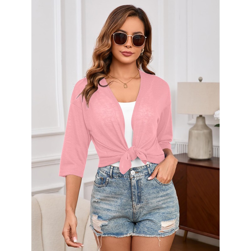 Heymoments Women's Summer 3/4 Sleeve Tie-able Shrugs Simple Comfy Lightweight Open Front Crop Cardigan Suitable for Summer Spring & Autumn