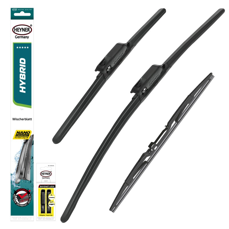 HEYNER Hybrid windscreen wipers - complete set consisting of 2 windscreen wipers, a rear wiper and adapter. Optimal wiping performance thanks to the combination of two technologies: traditional joints with stainless steel spring for optimal contact on the windscreen + flat bar technology with additional spring construction for optimum contact pressure and elegant design. Perfect aerodynamics even at high speeds thanks to additional contact pressure thanks to a subtle spoiler. The application of nano graphite technology guarantees maximum flexibility and durability. With waterproof plastic cover, so it is also suitable for winter. The package consists of: 2 x HEYNER Hybrid windscreen wipers, 1 x rear wiper, necessary adapters and covers for a perfect look of wiper arm constructions and assembly instructions (English language not guaranteed). Made with nano graphite technology for extra long life and quiet operation on the windscreen. The rubber has been successfully tested and tested with 1,500,000 wiping movements.