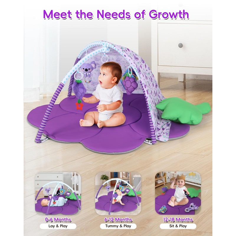 - 9-in-1 Baby Gym: Our activity gym includes 6 detachable sensory baby toys(1 Koala Rattle, 1 Red Wine Rattle, 1 Baby Soothing Towel-Multi Sensory, 1 .Grape Teether, 1 Self-Discovery Mirror, 1 Cloth Book), 1 detachable rest tent, 1 large non-slip play mat, and 1 removable elastic support frame, fully catering to your baby's early developmental needs.