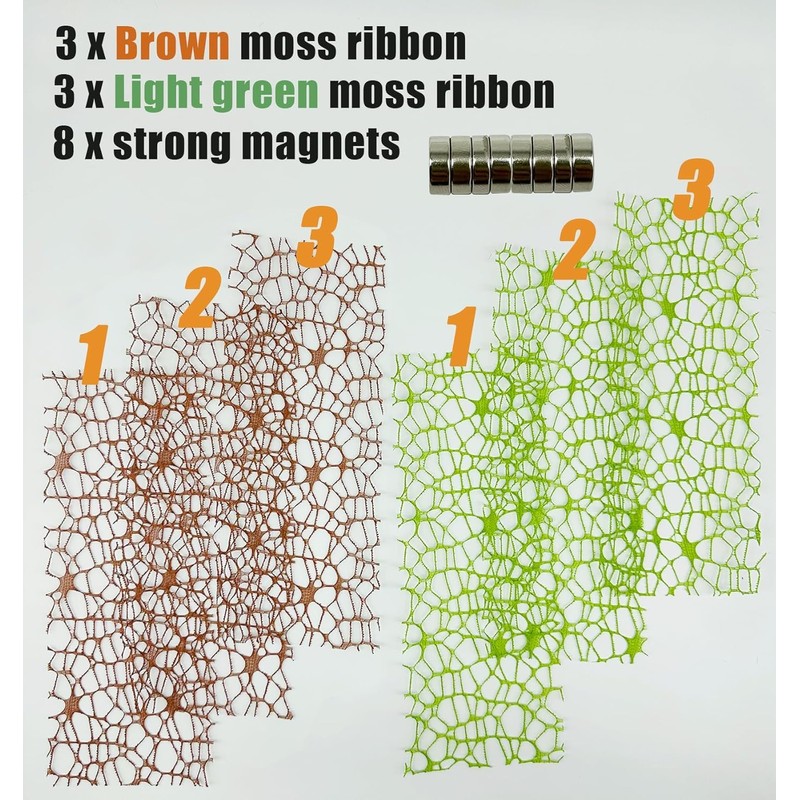 • 【Complete Decoration Set】Includes 3 green moss ribbons, 3 brown moss ribbons, and 8 strong magnets, providing everything you need to enhance your spider's habitat.