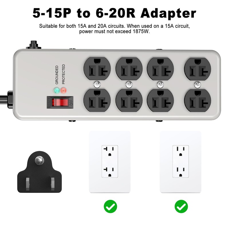- Compatibility: This multi-outlet surge protector power strip is compatible with 15A and 20A outlets. However, if used in a 15A system, ensure not to exceed 1875W to avoid overloading. It provides a reliable and efficient power solution for everyday use.