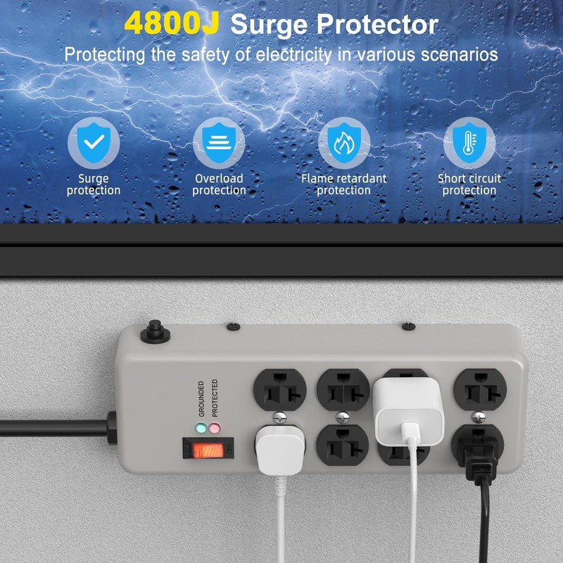 - Safety Features: With a built-in 4800J surge protector and a 20A circuit breaker, this power strip offers comprehensive protection against short circuits, overcurrent, overheating, and overvoltage. If the current surpasses 20A, the circuit breaker automatically shuts off power to prevent damage, and it’s easily reset by turning off the power and pressing the reset switch.