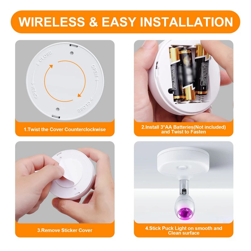 Simple Installation --Our stick on spotlights can be easily installed in 2 ways, double-sided tape or screws, you could stick it onto any smooth surface indoor. With adhesive, please keep the surface be clean and dry before installation, press and hold for a few seconds after installation to strengthen the adhesive. If the surface is rough or wet, pls use screws to achieve firm installation
