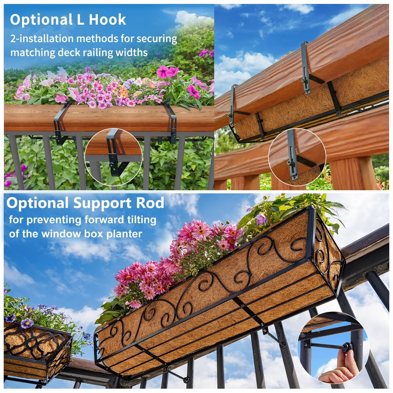 HFHOME 24 Inch Window Deck Boxes with Coco Liners for Porch, Fence, Patio, Balcony Hanging Flower Railing Baskets with Adjustable Brackets, Outdoor Garden - 6 Packs