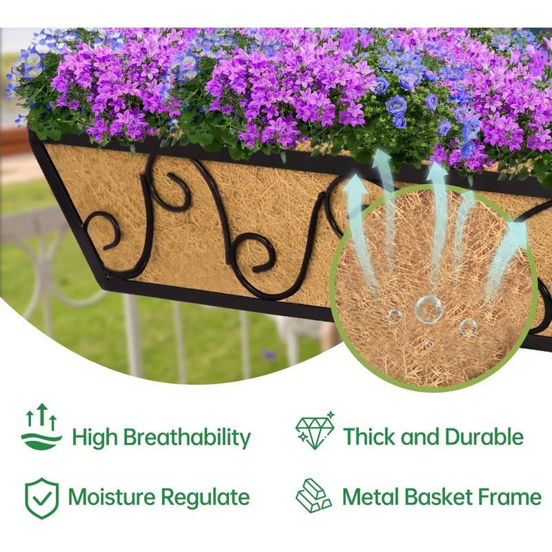 - Heavy Metal & Coconut Coir Fiber Liner: Crafted from rust-resistant carbon steel, this durable black planter box includes a coco coir liner for healthy plant growth. It is ideal for year-round indoor or outdoor use, with excellent airflow and water retention.