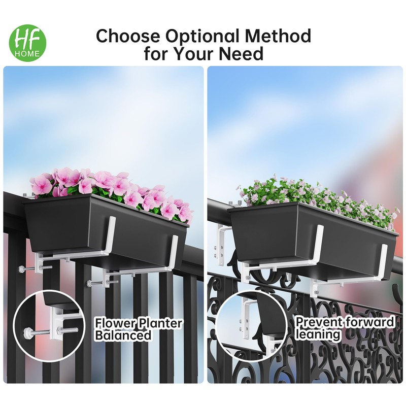 - 🍀 【What You Get】Set of 2 adjustable planter brackets. The top width of the railing flowerpot bracket can be adjusted by 2 inches to 6.8 inches freely according to the width of the railing. Note: A planter pot isn't included.