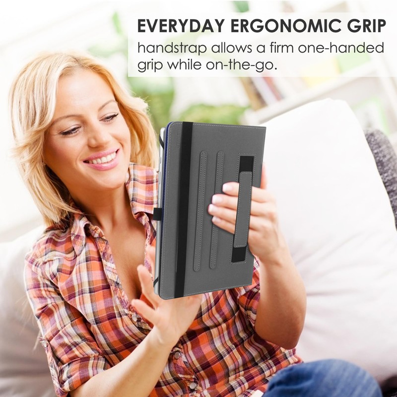 - 【 HIGH QUALITY MATERIAL 】-10 inch tablet case android with premium synthetic PU leather exterior protect the tablet from scratches, impacts, dust or any other daily damage.The Outside Elastic band secures the case closure, easy snap on and off,The internal hand strap for comfortable one-handed use