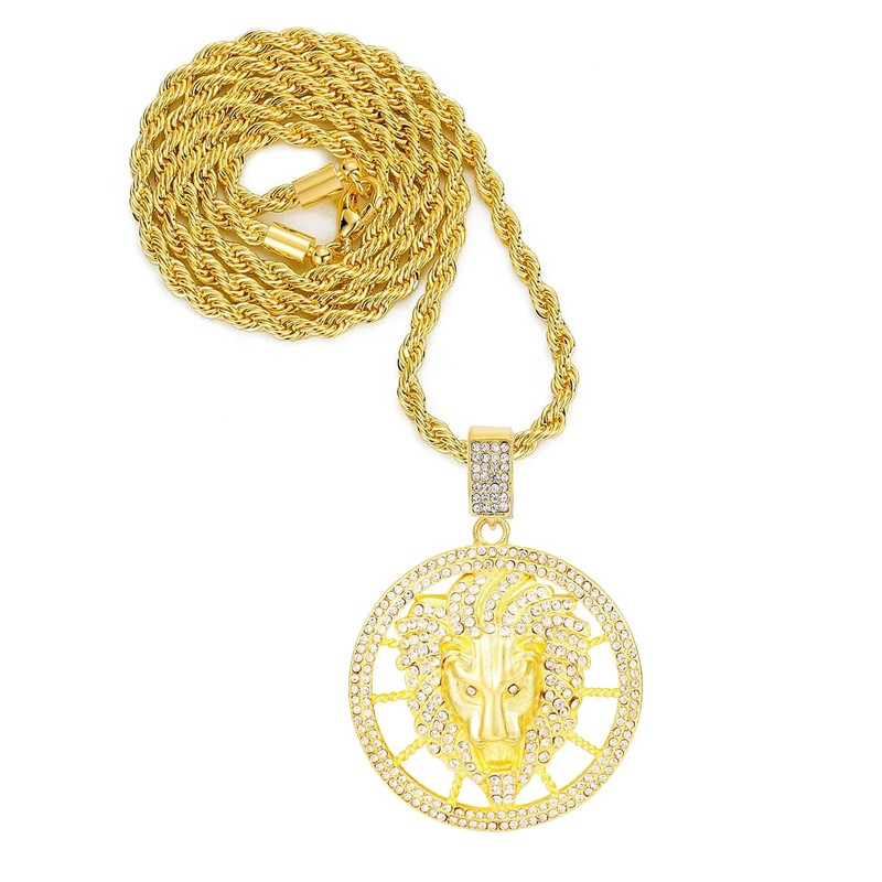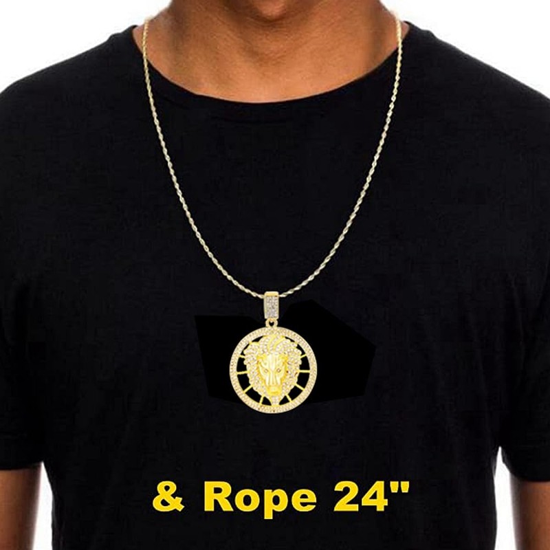 HH BLING EMPIRE 14k Gold Silver Plated Hip Hop Rapper Pendant Chain Necklace for Men, Iced Out Diamond King Lion Pendant with 4mm Rope Chains 24 Inch (Lion-Gold,& Rope)