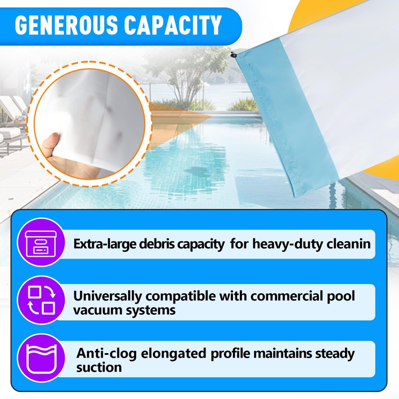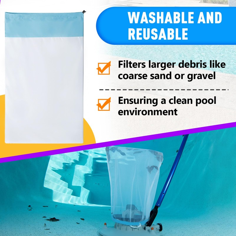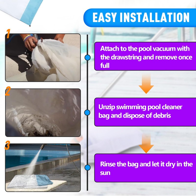 - Easy to Use: 1. Attach to the pool vacuum with the drawstring and remove once full. 2. Unzip swimming pool cleaner bag and dispose of debris. 3. Rinse the bag and let it dry in the sun