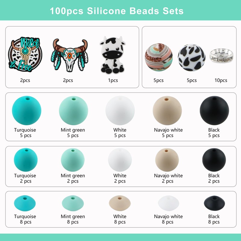 HHCFAST 100PCS Silicone Beads Set, Lentil Rhinestone Spacer Print Silicone Beads 15mm and 12mm for Pens and Keychain Making(Turquoise Cow)