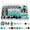 - Quantity and Size of Assortments: The assortment contains 25pcs 15mm silicone beads, 10pcs print silicone beads, 10pcs 12mm silicone beads and 40pcs silicone lentil beads, 5pcs Cow silicone beads animal, 10pcs 8mm rhinestone spacer beads. They are packed in a small plastic container.