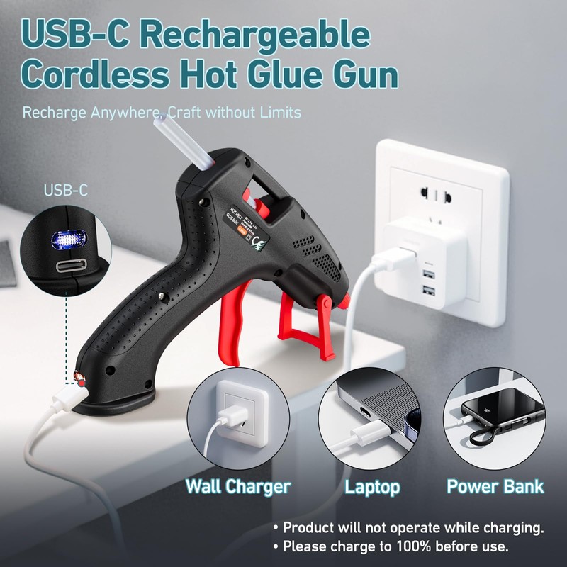 - USB-C Charging: you can charge the hot glue guns by wall charger, laptop and power bank, which is convenient for you.(1pcs 1m cable included)