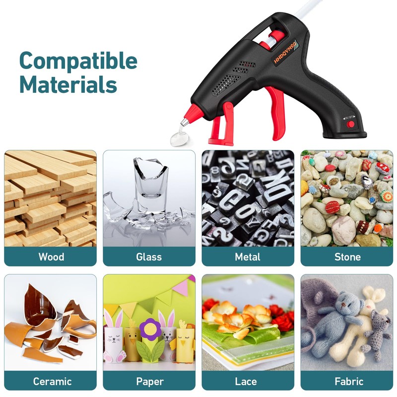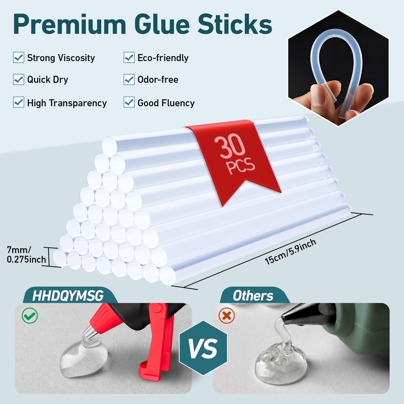 - 30PCS Premium Glue Sticks: the hot glue gun and sticks set will come with 30PCS premium glue sticks(0.275'' x 5.9'') for free. The glue sticks are compatible with most materials, such as paper, cotton, plastic, fabric, glass and etc. So you can glue anything you want