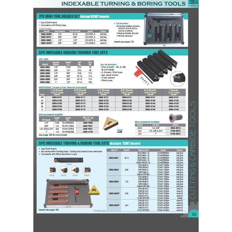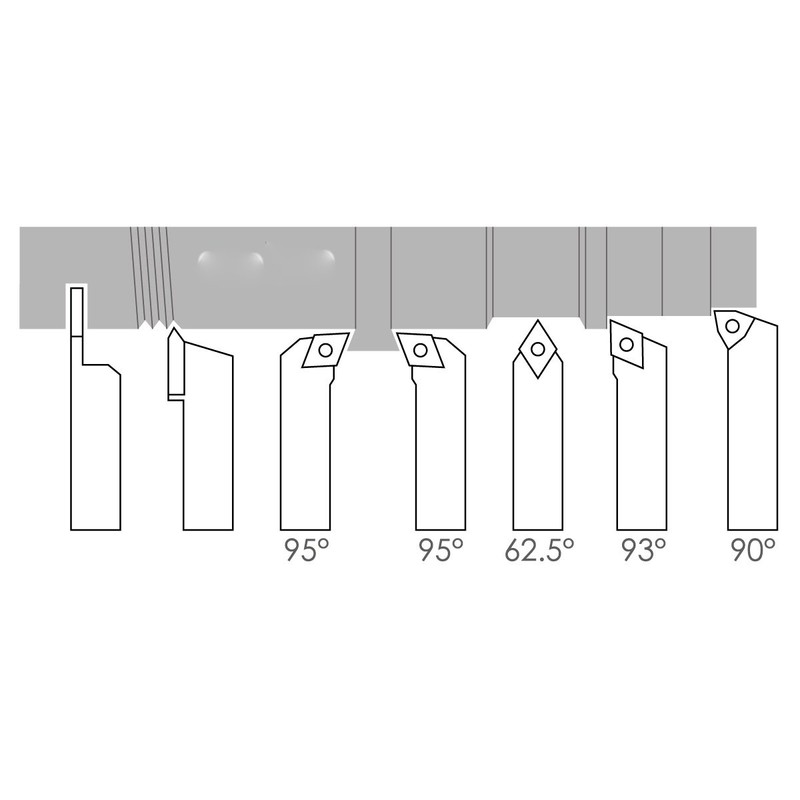 • Multi-purpose Indexable tools; 7Piece set Includes (A) Right hand 90 degrees, (B)Right hand 93 degrees, (C) Right hand 95 degrees, (D) Right hand 62.5 degrees, (E) Left Hand 95 degrees, (F) External threading, (G) Cut-off tool