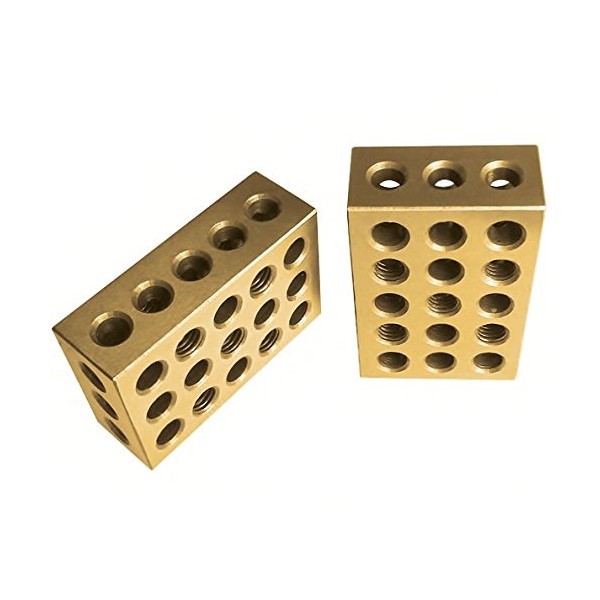 Heat treated and case hardened to HRC 55 to 60. Hardened and precision Ground on all 6 sides of each block. Accuracy with squareness on all sides within .0002" per inch. 23 holes consists of 5 tapped holes that are 3/8"-16 for clamping and 18 untapped holes. Cross drilling design gives minimum weight and maximum strength.