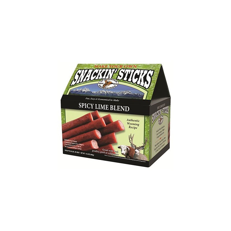 Hi Mountain Snackin’ Sticks Kits are the easy way to make your own homemade meat sticks. You can make Snackin’ Sticks with beef, pork, poultry and wild game. Each kit includes seasoning, cure, casings and easy-to-follow directions. Ingredients: Each box contains two 4.2 oz. packets of Hi Mountain Cure containing the following indgredients: Salt, sugar, sodium nitrate (.85%), carmael color; and two 3.0 oz Spicy Lime Blend seasoning packets containing the following ingredients: Dextrose, salt, chipotle pepper, sugar, lime juice powder, dehydrated garlic, rice concentrate (anti-caking agent), dehydrated onion, cayenne pepper, natural hickory flavor, citric acid, black pepper, spice extractives, oil of lime.