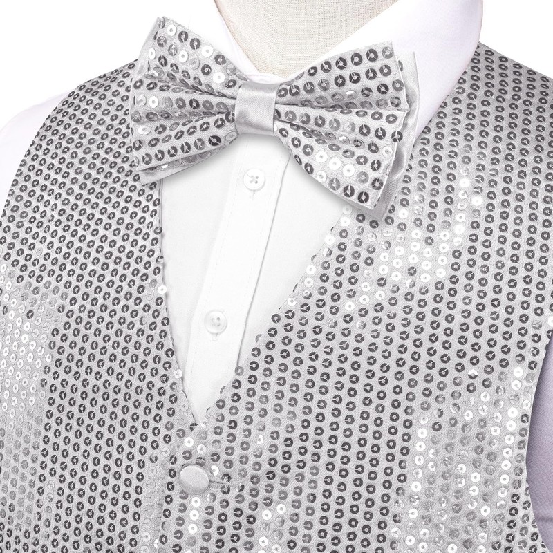 Hi-Tie Sequin Silver Vest Bowtie Set for Men V Neck Regular Fit Tuxedo Wedding Party Dinner, X-Large